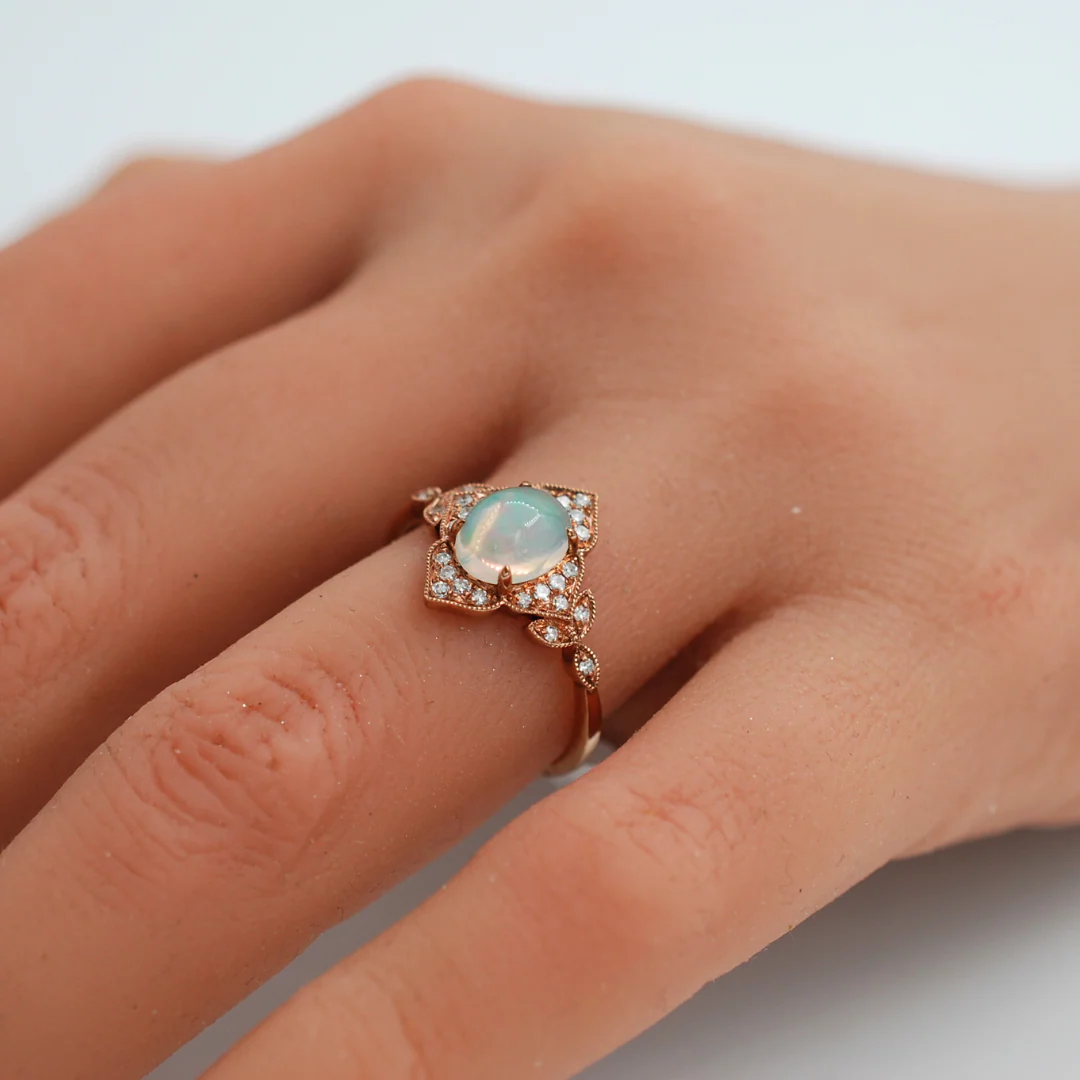 Crafted from beautiful 9ct rose gold, this diamond and opal ring features a stunning 1.97ct opal stone and sparkling 0.14ct diamonds. Elevate any outfit with its unique and elegant design, perfect for any occasion. (dr216)